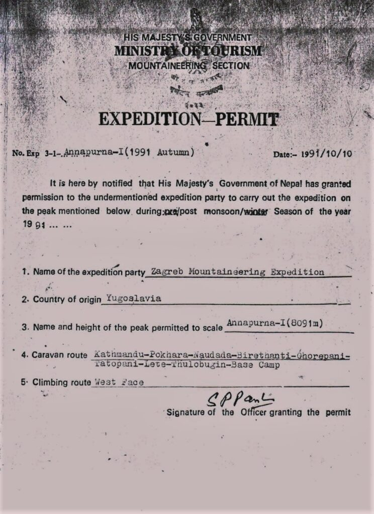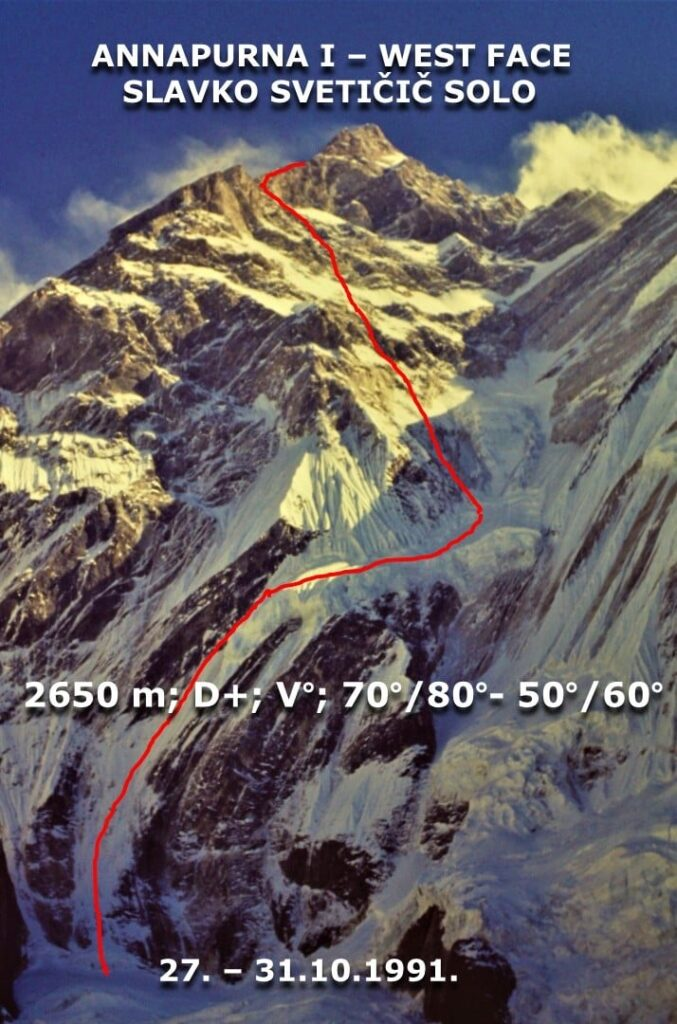 Zahodna stena Annapurne I (8091 m) je visoka skoraj 3000 m, v tistem času pa je bila v njej le ena smer (Messner–Kammerlander) v desnem delu stene, preplezana leta 1985.Slavc na zagrebški zimski odpravi 1990 »Anapurna I«, ko je načrtoval solo vzpon v zahodni steni in sestop po severni strani, po kateri so plezali ostali člani. Zaradi stalnih plazov so odnehali na 7000 m, zato je Slavc vzpon po steni preložil na naslednje leto. Zaradi njegovih – praviloma skrajno zahtevnih – solo ponovitev in prvenstvenih smeri ter izjemnih nizov hitrih vzponov v enem ali nekaj dneh v svetovnih gorstvih ga je stroka uvrstila med najizrazitejše alpiniste vseh časov. Žal mu je junija 1995 v Karakorumu pri plezanju prvenstvene smeri v južni steni Gasherbruma IV dolgotrajno snežno neurje onemogočilo nadaljnje gibanje in je zaradi podhladitve umrl na bivaku na višini 7100 m.Moja naloga v odpravi leta 1991 je bila, da organiziram logistiko, spremljam vzpon iz baznega tabora na 4300 m in – najpomembneje – da pri nepalski administraciji pridobim dovoljenje za vzpon v Zahodni steni. Takrat je morala za vsako odpravo državna planinska zveza (v tem primeru Planinski savez Jugoslavije) poslati pisno jamstvo za odpravo, da se je nato sploh lahko dobilo dovoljenje. Ker se je nekdanja država v tistem času močno razpadala, sem poleti 1991 nekako uspel izposlovati nepalsko garancijo za dovoljenje prek jamstva Planinske zveze Hrvaške, jeseni pa sem jo dobil na ime Zagreb Mountaineering Expedition.Žal zaradi vojne na Hrvaškem nisem mogel odpotovati s Slavcem. On je hitro prišel v bazni tabor, bil je dobro aklimatiziran in po nočitvi v majhnem šotoru je že 27. 10. na 5150 m vstopil v steno ter se isti dan povzpel za 1100 višinskih metrov do 6250 m.Po dolgi prečnici po zelo težkem in strmem ledu z naklonom do 70° se je povzpel na 6900 m in tam prenočil.Sledil je kombiniran teren do 7300 m in nočitev v že napol raztrganem šotoru.Tisti dan je prišel do območja v steni z izrazito močnim vetrom in je moral zaradi njegovih nevihtnih sunkov vzpon večkrat prekiniti. Dne 31. oktobra je dosegel 7950 m, blizu normalne smeri s severa, le še 140 metrov pod vrhom, vendar ga je veter prisilil k umiku na 7800 m, kjer je bivakiral.