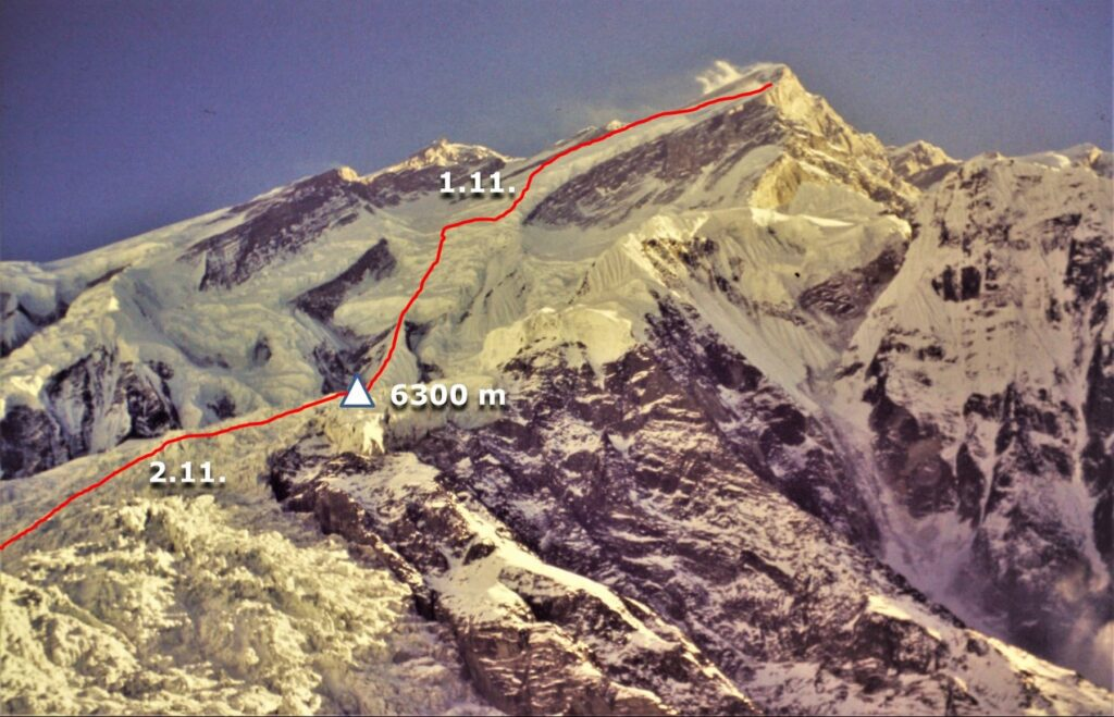 Prvega novembra je bilo jasno, da zaradi močnega vetra ne more nadaljevati proti vrhu, zato je prečil na severno stran ter sestopil do 6300 m in tam bivakiral. Naslednji dan zvečer se je po sedmih dneh vrnil v bazni tabor. Nekaj Nepalcem, ki so mu ob prihodu pomagali nositi opremo do baznega tabora, je pred vzponom rekel, naj ga čakajo pet dni; oni so to podaljšali še za dva in tisto jutro odšli v prvo vas v vznožju gore, pri čemer so mu pustili šotor in opremo. Utrujenemu Slavcu zvečer ni bilo do postavljanja šotora, zato je osmo noč preživel na prostem in naslednji dan dohitel nosače.Slavčeva smer v Zahodni steni Anapurne I z ocenami.Približno dvajset dni po Slavčevem odhodu v Nepal mi je uspelo urediti, da tudi sam odpotujem tja in nato s Twin Otterjem nadaljujem do Jomosoma, od tam pa peš do baznega tabora. Vendar je prišla novica, da je Slavc že iz Leteja na poti v Katmandu, in to je najino srečanje na Thorong Peaku nekaj dni pozneje. S Slavcem sem se srečeval tudi v naslednjih letih, zadnjič pa za veliko noč 1995 v Paklenici. Sedel sem pri Dinku, ko je sproščeno oblečen šel po cesti proti kanjonu, mi pomahal in rekel, da gre malo na sprehod. Niti dve uri nista minili, ko se je vrnil k Dinku. Vprašal sem ga, kje je bil, on pa je odgovoril, da je solo preplezal »Velebitaša«!